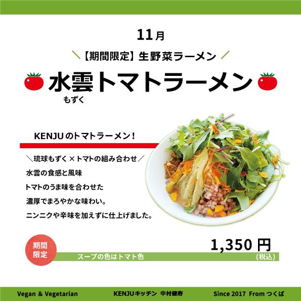 メニュー: ・山盛り「生野菜ラーメン」 定番3種+期間限定 ・うま藻つけ麺 ・うま藻あえ麺 ※臨時休業あり 毎月の営業カレンダーは